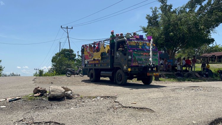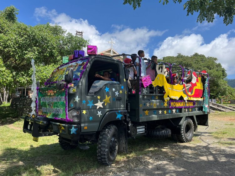 LINTASTIMURMEDIA.COM - Eban,NTT - Ide Kreatif dalam sebarkan Kebahagiaan, Mako Satgas Yonkav 6/Naga Karimata Sulap Mobil Truck menjadi Kereta Santa Claus dalam menghantarkan sukacita dan kegembiraan kepada Masyarakat Desa Eban, Kec. Miomaffo Barat, Kab. TTU, Prov. NTT (25/12/23)