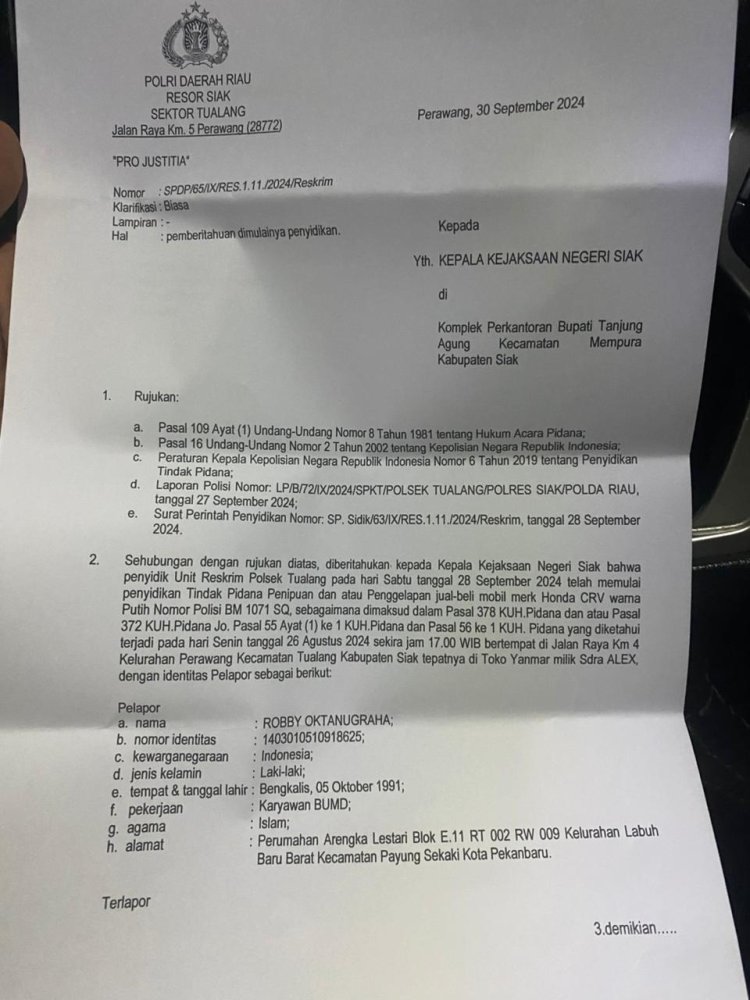 LINTASTIMURMEDIA.COM - PEKANBARU - Kasus Penipuan dan Penggelapan Jual Beli Mobil Honda CRV di Siak: Pihak Kuasa Hukum Tuntut Tindakan Tegas dari Polsek Tualang, Kasus dugaan tindak pidana penipuan dan penggelapan dalam jual-beli mobil merk Honda CRV dengan nomor polisi BM 1071 SQ yang terjadi pada Senin, 26 Agustus 2024 di Jalan Raya KM 4, Kelurahan Perawang, Kecamatan Tualang, Kabupaten Siak, masih belum menemukan titik terang. Hingga kini, Polsek Tualang belum mengambil tindakan tegas atas pengaduan tersebut.