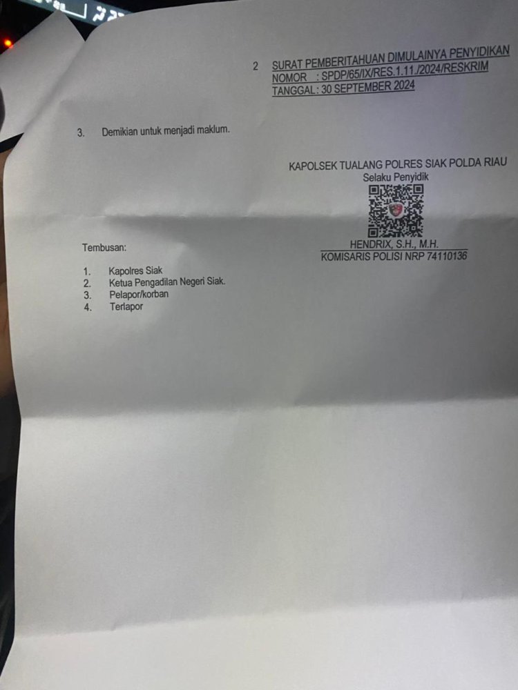 Dalam kasus ini, korban telah menyampaikan bahwa ada dugaan keterlibatan 7 orang, termasuk oknum kepolisian. Laporan resmi telah dibuat dengan Nomor Polisi LP/B/72/IX/2024/SPKT/Polsek Tualang/Polres Siak/Polda Riau pada 27 September 2024. Dugaan intimidasi terhadap korban muncul setelah kasus dugaan penipuan ini terjadi, yang menimbulkan kekhawatiran adanya keterlibatan aktor yang sama dalam kedua peristiwa tersebut.