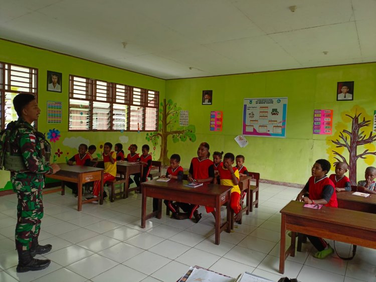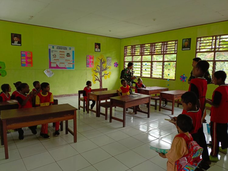 Satgas Yonif 642/Kps Bantu Pendidikan dan Bagikan Alat Tulis di SDN Yabore, Teluk Wondama